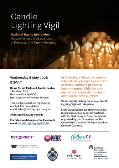 Since 2005 Candle Lighting Vigils have taken place annually across Australia, with the first being in Queensland and organised by the 15 members of the Queensland Domestic Violence Services Network (QDVSN). These events continue to be held annually across the country, serving as a poignant reminder of the need for ongoing awareness, prevention, and support.