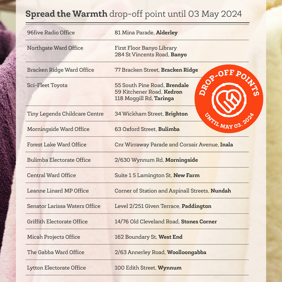 Donations can be dropped off at one of our dedicated drop-off points across Brisbane up until Friday 3 May 2024. Please see below for to find your nearest drop-off point.