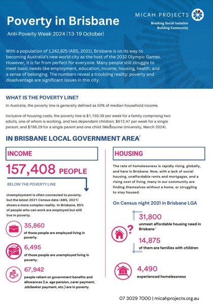 With a population of 1,242,825 (ABS, 2021), Brisbane is on its way to becoming Australia’s new world city as the host of the 2032 Olympic Games. However, it is far from perfect for everyone. Many people still struggle to meet basic needs like employment, education, income, housing, health, and a sense of belonging. The numbers reveal a troubling reality: poverty and disadvantage are significant issues in this city.